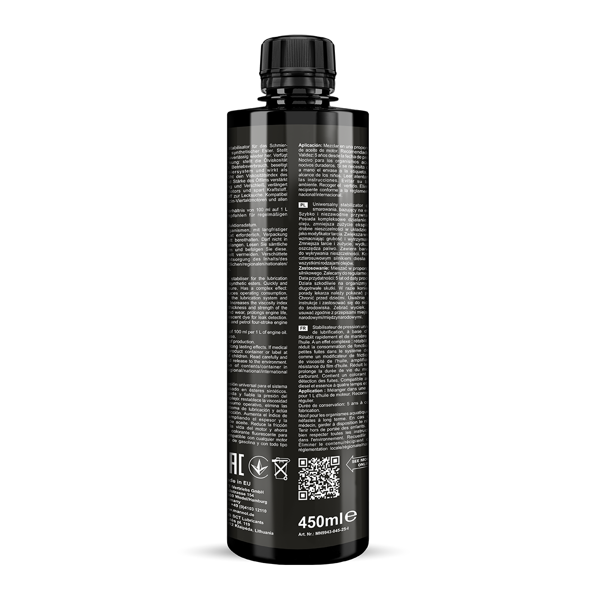 Protège moteur multifonctionnel innovant en stabilisant la pression dans le système de lubrification – un additif pour huiles moteur à base d'esters synthétiques (huiles du groupe V). C'est un produit complexe : un stabilisateur de viscosité protégé l'huile contre la liquéfaction, un scellant du système de lubrification moteur et un modificateur de friction. Il convient à tous les types de moteurs à quatre temps – moteurs diesel et essence et tous les types d'huiles – synthèses, semi-synthétiques, minéraux, y comprendre les types contenant des esters.