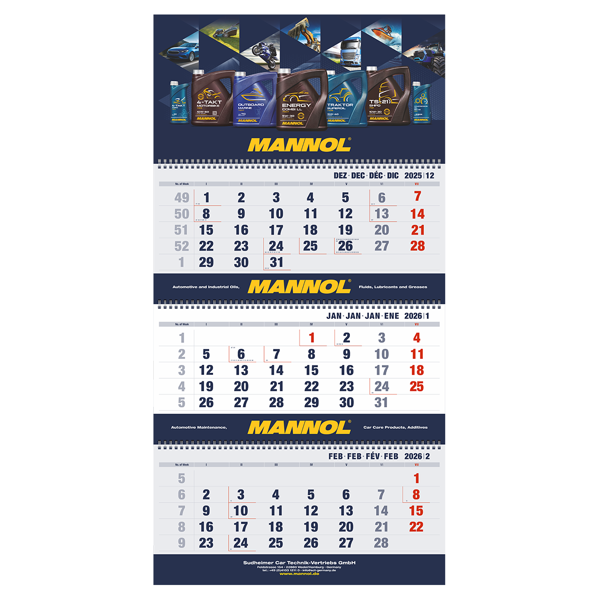 MANNOL 2026 Calendrier mural pliant en 3 parties.