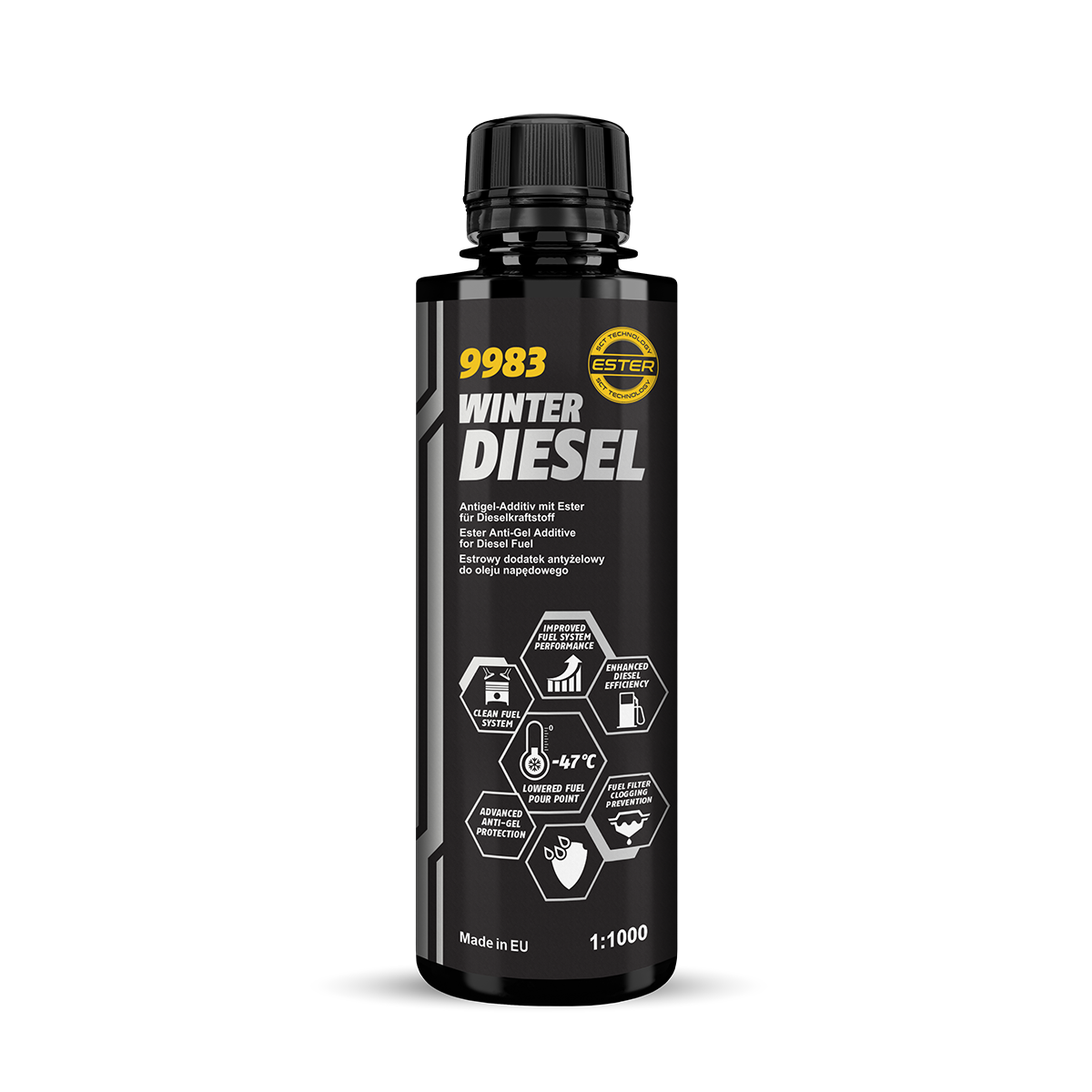 MANNOL Winter Diesel – a special anti-gel additive developed using a unique technology to reduce the pour point (gelation) and the maximum filterability temperature of both summer and winter diesel fuel grades. It is suitable for any type of diesel fuel and all types of diesel engines (atmospheric and turbocharged) with any fuel systems, equipped and not equipped with diesel particulate filters and catalysts. It does not change the basic properties of the fuel, only improves its low-temperature characteristics.