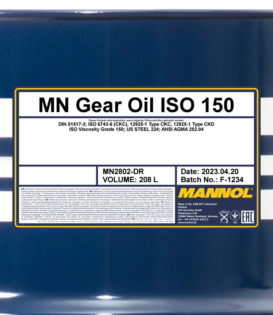 It is recommended for industrial closed gear wheels (reducers), lubricated by circulation or spraying (oil mist), especially when there are heavy loads and high temperatures, vibrations, high speed and sliding friction. It may be used for lubricating various mechanisms and separate parts that operate under heavy loads: all types of gear systems (including worm and screw), clutches and all types of bearings: roller, friction, etc., where the required level of operating properties is DIN 51517 Part 3 CLP and viscosity is ISO VG 150.