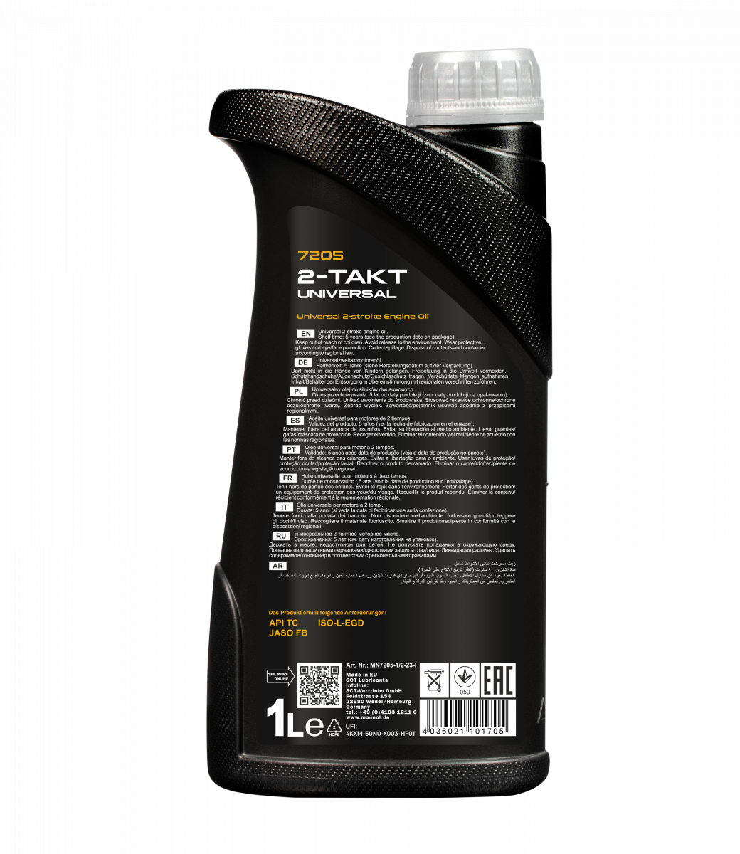 It is designed for all types of 2-stroke engines: motorcycles, mopeds, scooters, motor scooters and other two-wheeled motor vehicles with the required oil grade of API TC and JASO FB.